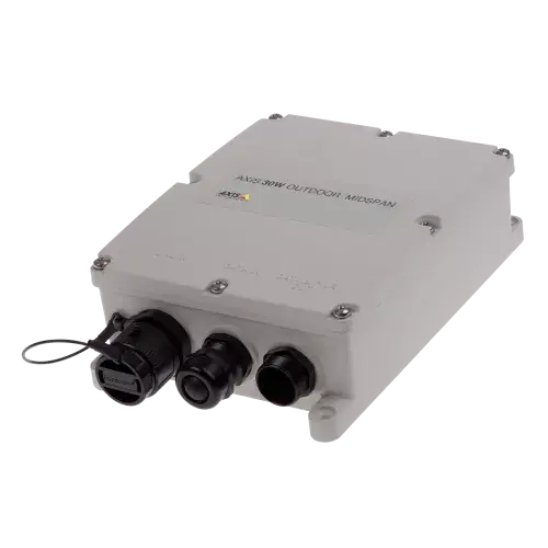 AXIS 30 W Outdoor Midspan is an outdoor ready IP66-/IP67-rated midspan compliant with IEEE802.3af and 802.3at. With built in 6kV surge protection. Delivers up to 30W. Temperature specification: 40°C to 65°C (-40°F to 149°F) for 30W.