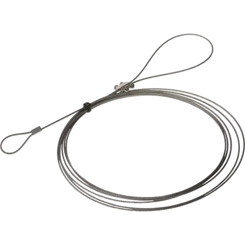 Stainless steel safety wire 3 m (10 ft) long, with a fixed loop in one end and an adjustable loop with a plated brass wire lock in the other. Suitable for both indoor and outdoor use.