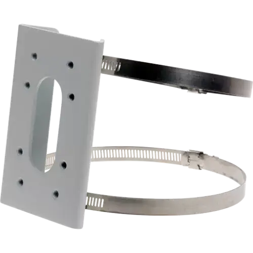 Pole mount for AXIS T92F10 Outdoor Housing, with 1 pair stainless steel straps included per piece. 6-piece pack. Requires AXIS T94X01A Wall Mount 6PCS (sold separately).