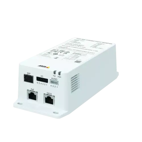 AXIS TU8003 90 W Connectivity Midspan with portcast technology uses the camera’s IP address to provide seemingly camera-integrated audio and I/O connectivity. This enables audio and video in one stream over the network with no extra VMS license. It supports Axis PTZ cameras using up to 90 W (IEEE 802.3bt). Plus, it’s compatible with PTZ cameras using IEEE 802.3af/at and Axis High PoE.